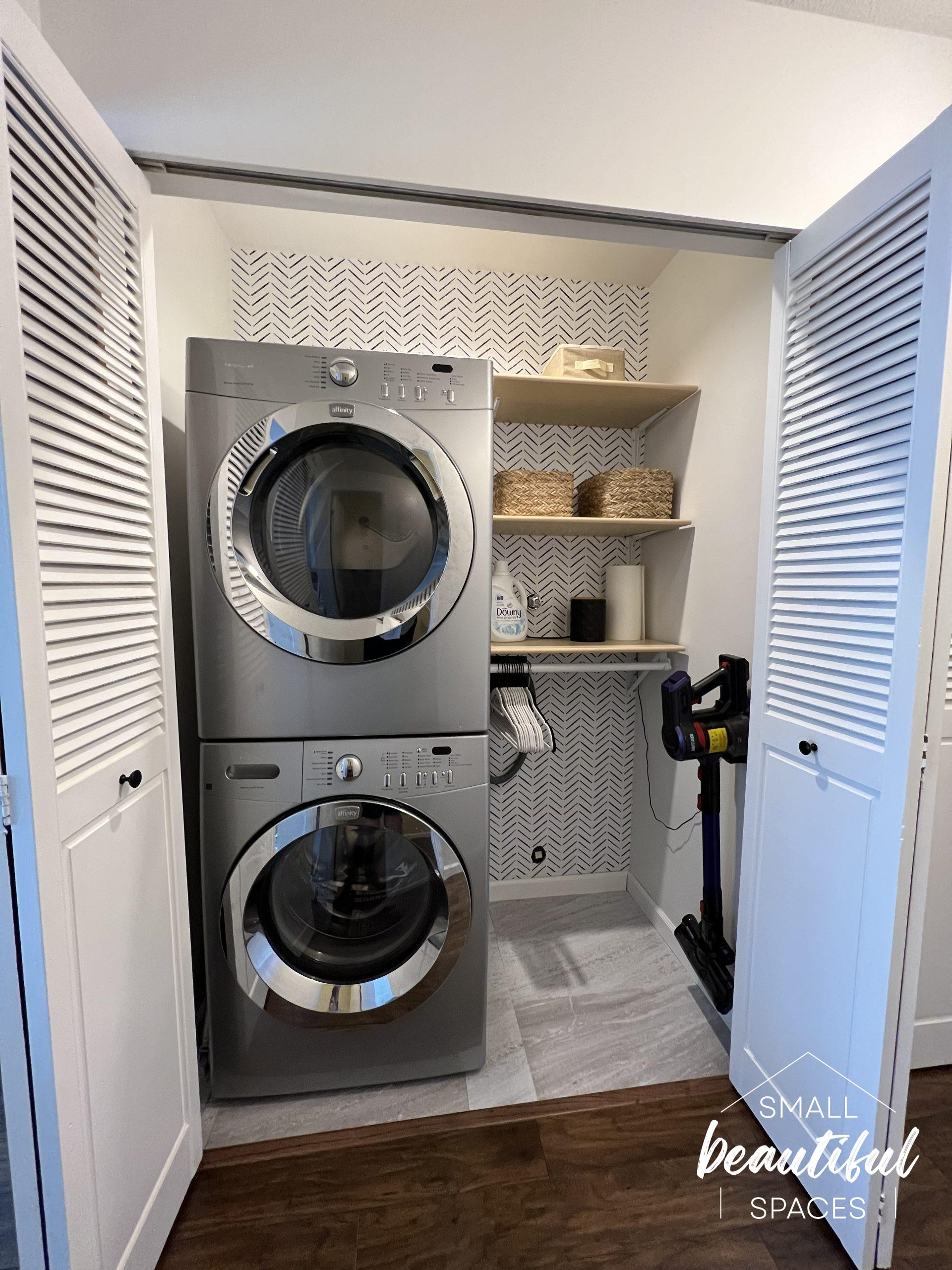 Here is the finished space! I love the functionality of the shelving. I love how there is room to store a laundry basket underneath and of course I LOVE the clothing rod allowing me to hang up clothes that I cannot dry. Another bonus is that I now have a place to store my vacuum and can have it charging as well. This is exactly how I envisioned it coming together and I’m so happy!