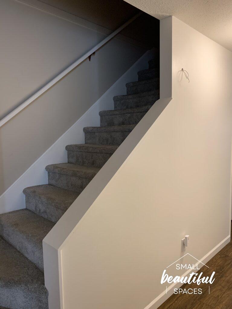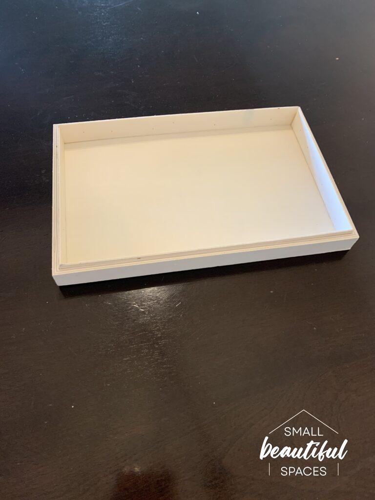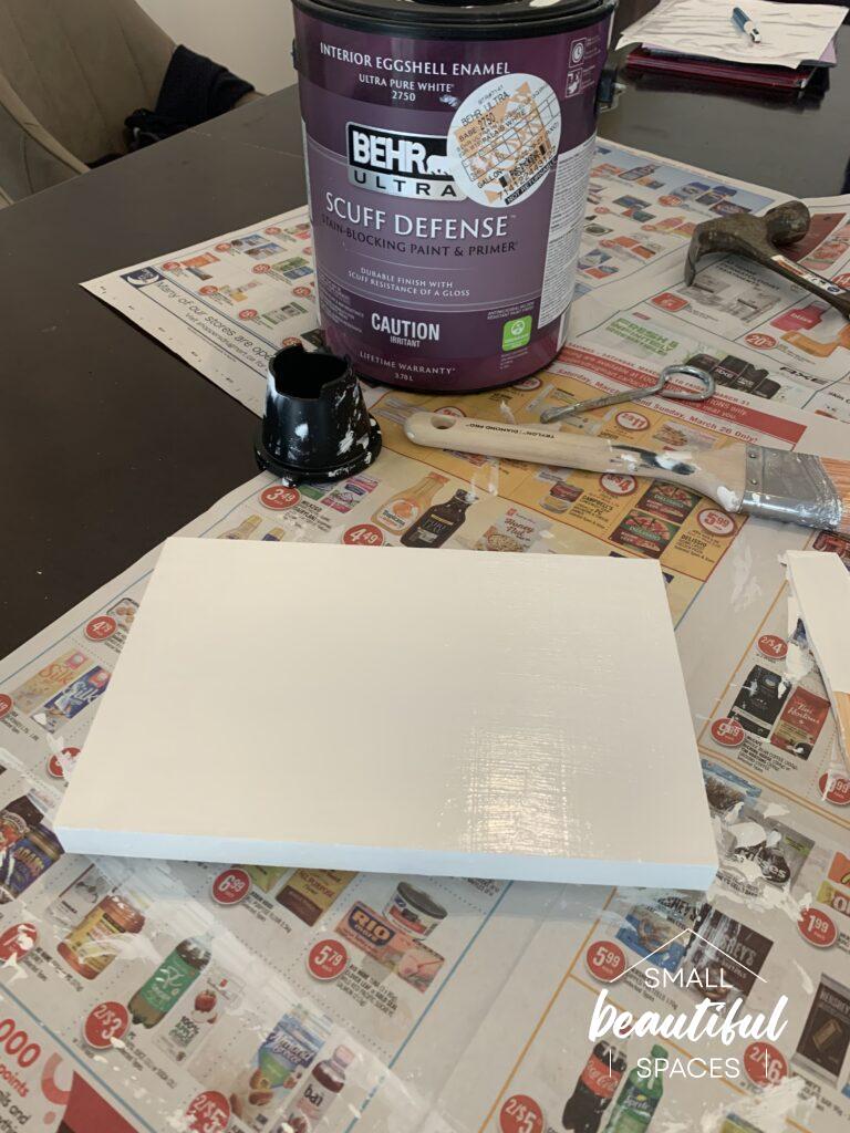 After measuring, shop around for a box that fits your area. I found mine at Dollarama and I ended up using the top of the box as a cover because I wanted it to be as close to the wall as possible. I decided I didn’t want my box to stand out at all but rather to blend into the wall as much as possible. So I went ahead and primed and painted the box lid Palais White by Behr which is the same colour as my wall.